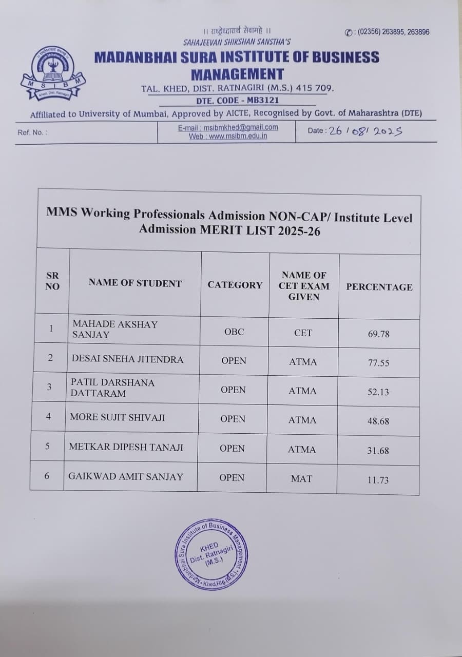 It is necessary for a student seeking admission in the institute to go through the procedure of registration at facilitation centre and get documents varified. Thereafter the student needs to participate in CAP roundS and get seat allocated. MSIBM renders all help at every stage to ensure that your registration to admission process is handled smoothly.